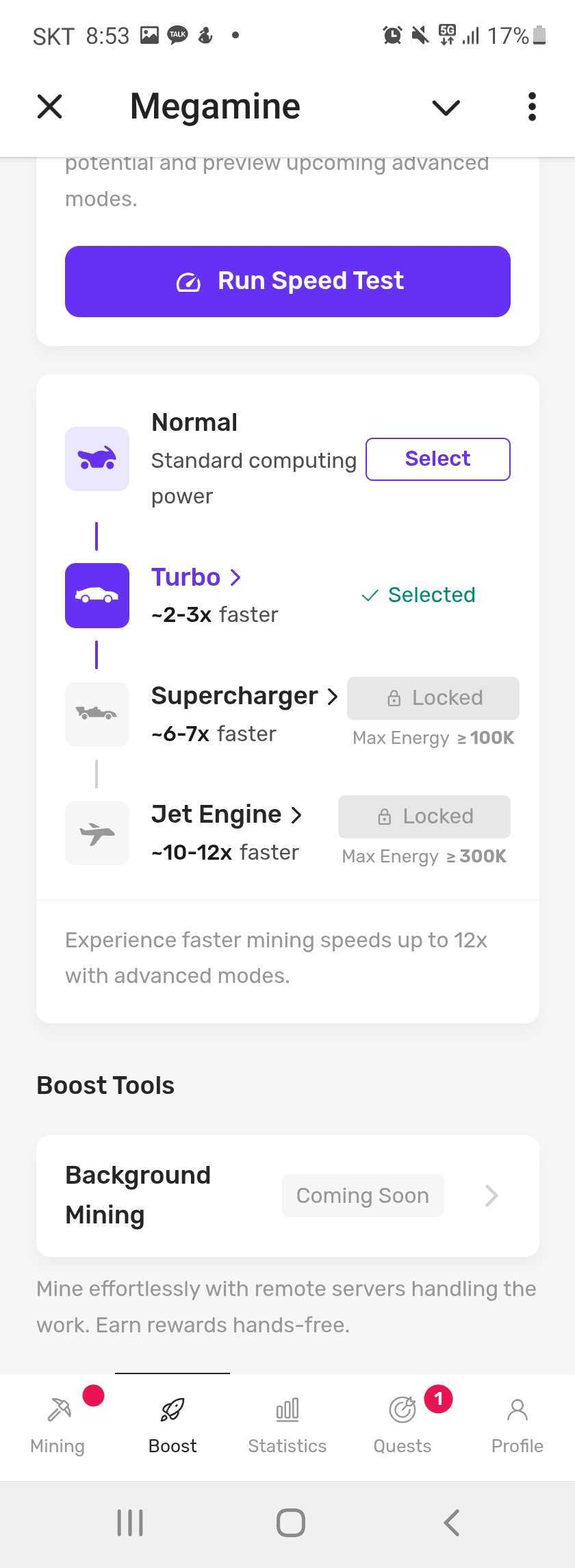 그리고 MegaMine 채굴 속도도 조절이 가능한데 좀 더 빠르게 채굴을 하고 싶다면 터보를 선택이 가능합니다.