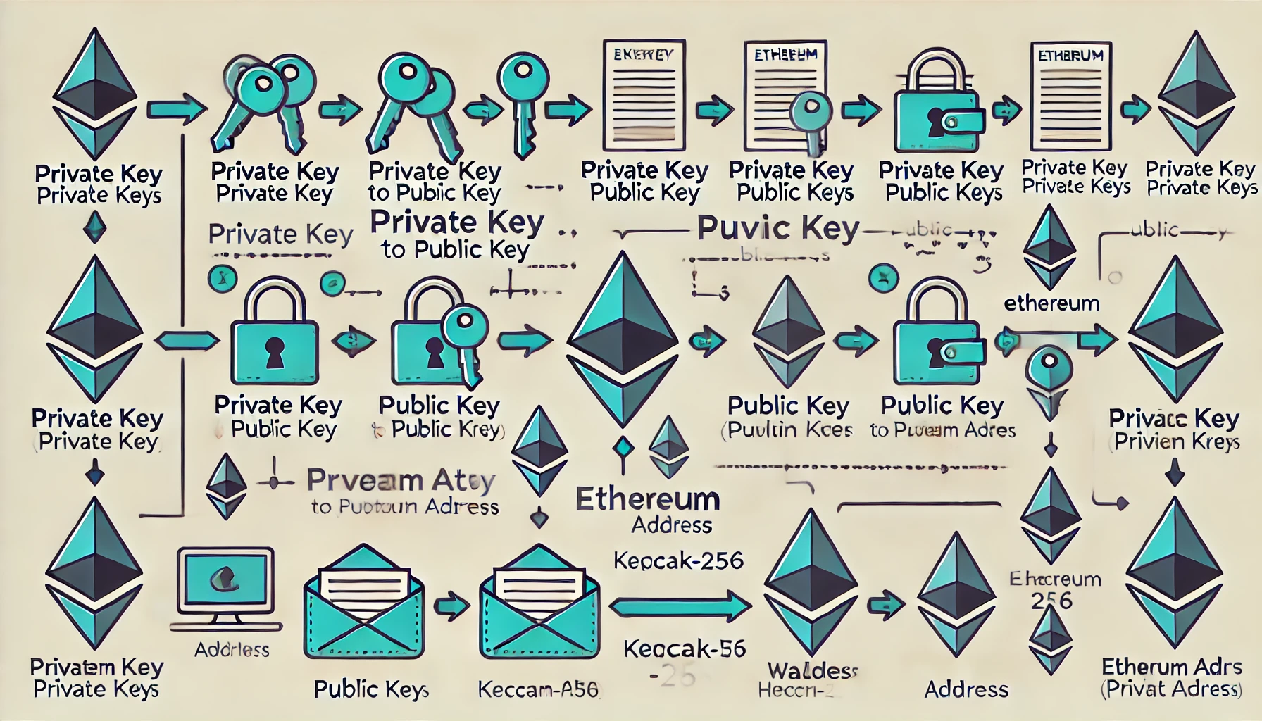 | 생성 방법 | 개인키 → 공개키 | 공개키 → 주소 (Keccak-256 해시) |