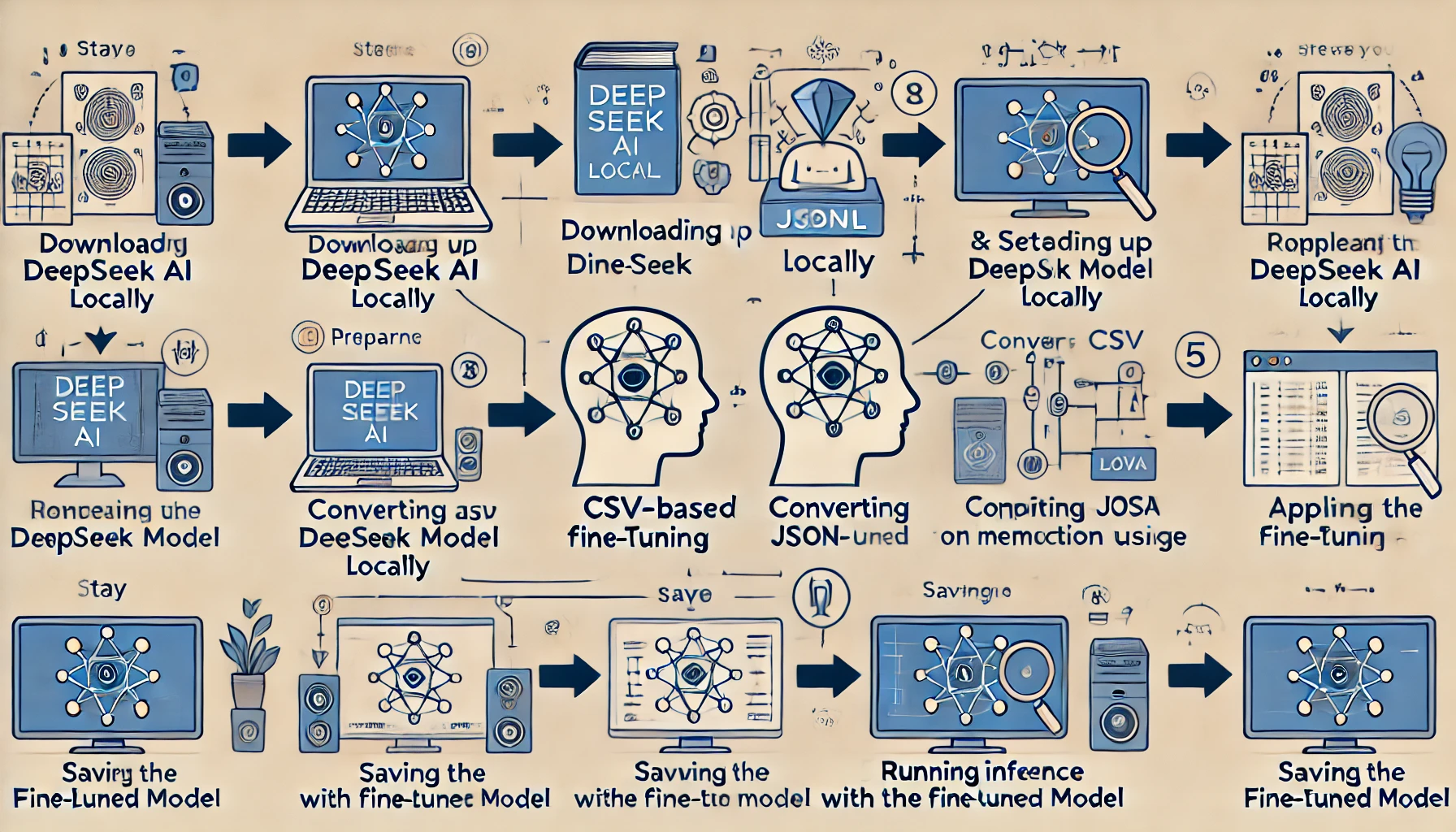 DeepSeek(딥싱크)과 같은 오픈소스 LLM을 로컬에서 돌리고 파인튜닝하는 과정은 크게 다섯 단계로 나눌 수 있습니다.