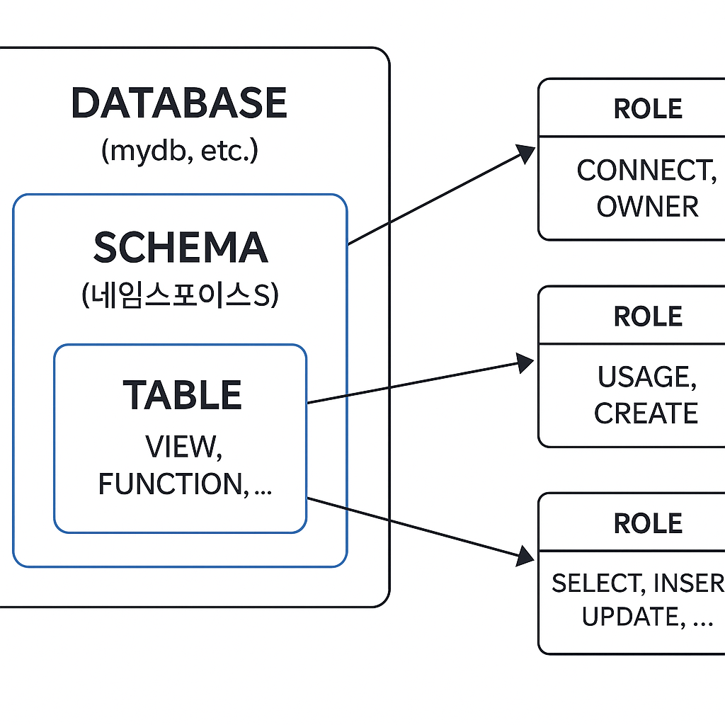 | 스키마 (public) | USAGE, CREATE | 객체를 만들거나 접근하려면 별도 권한 필요 |