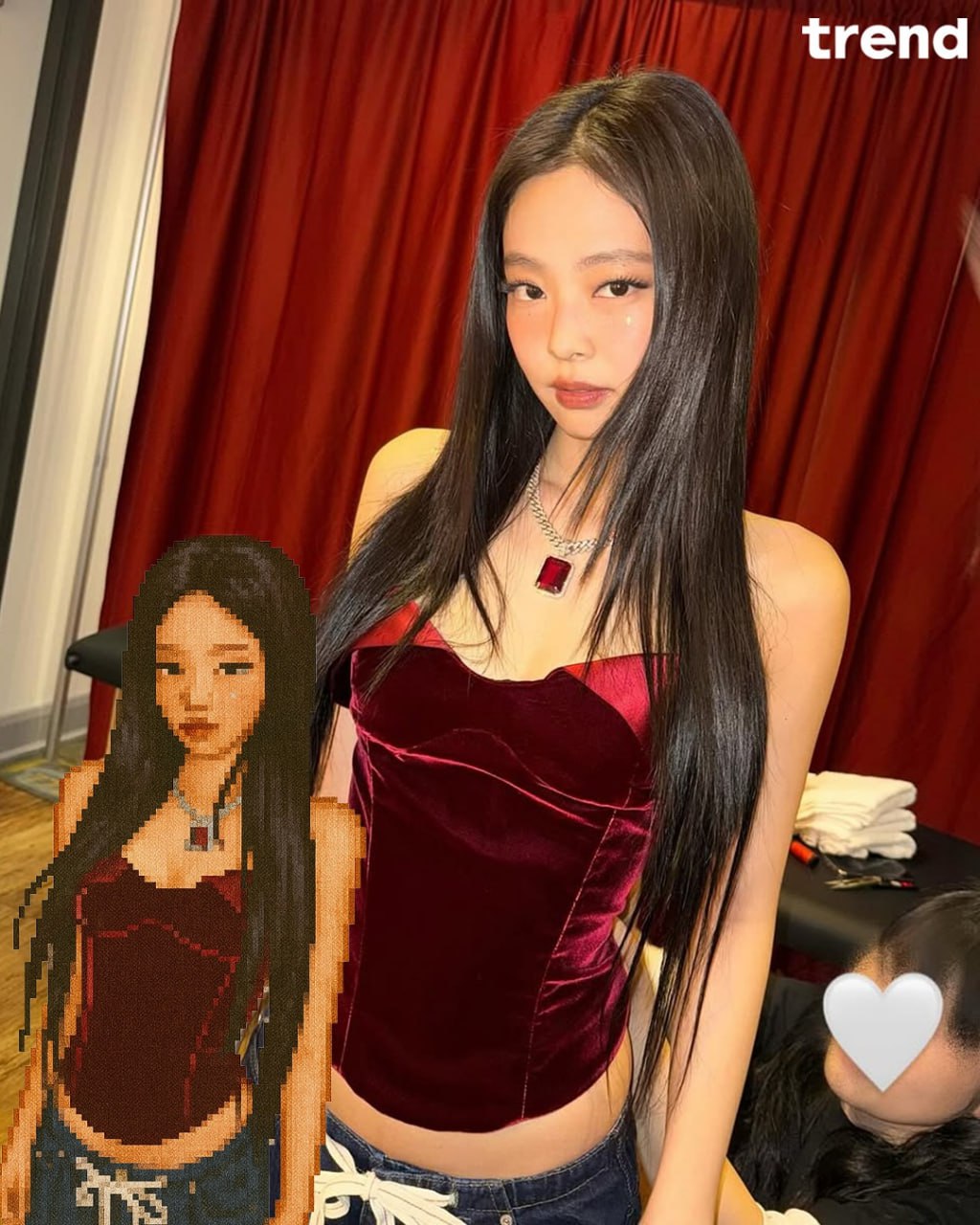 Learn the pixel style of the everskies, imitating shapes, faces, facial expressions, costumes, and harstyles. Draw an illustration of a person using the hairstyles, clothes, and accessories of the person in the attached image. PNG background, as long as a complete person