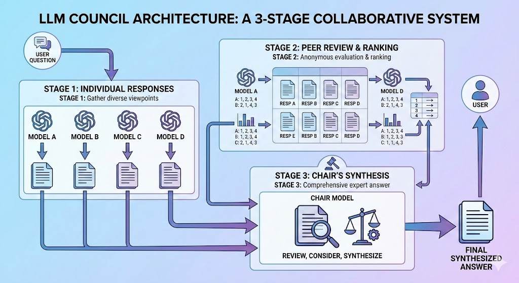 LLM Council은 여러 AI 모델이 협력하여 상호 평가와 종합을 통해 고품질 응답을 생성하는 3단계 심의 시스템입니다.