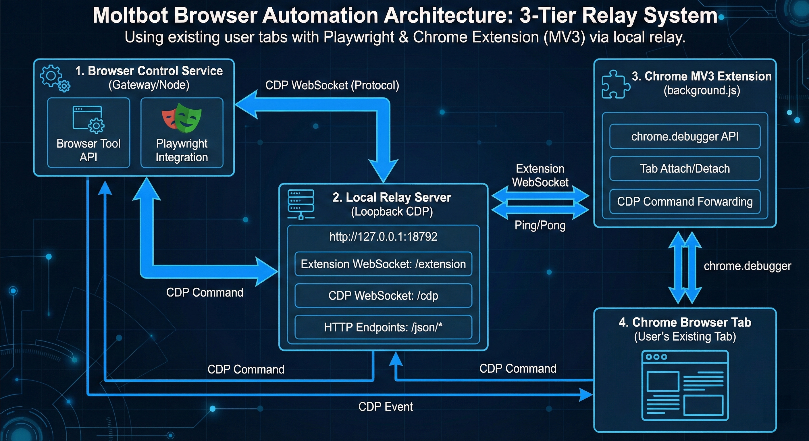 Moltbot의 브라우저 자동화 시스템은 매우 독특한 아키텍처를 가지고 있습니다. 일반적인 브라우저 자동화 도구들이 별도의 브라우저 인스턴스를 실행하는 것과 달리, Moltbot은 Chrome 확장 프로그램을 통한 Relay 방식을 사용하여 사용자의 기존 Chrome 탭을 제어할 수 있습니다.