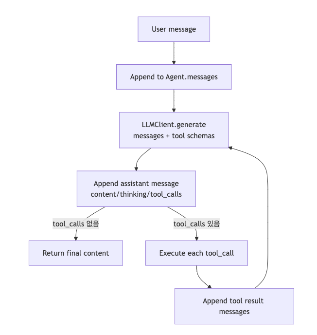 Agent의 내부 루프는 대략 다음 규칙으로 동작합니다(mini_agent/agent.py 참고).