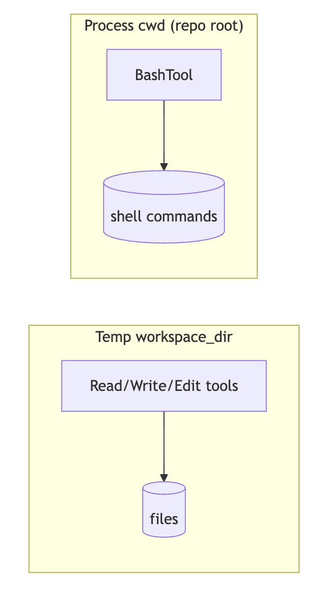 - 파일 도구는 임시 워크스페이스에서, bash 도구는 기본 cwd에서 실행되는 점이 포인트(의도적으로 관찰해볼 만함).