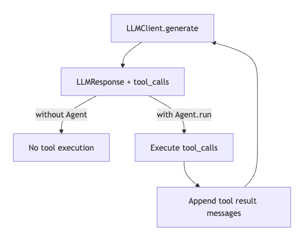 - LLMClient.generate(...)는 “tool_calls를 포함한 응답”까지만 담당