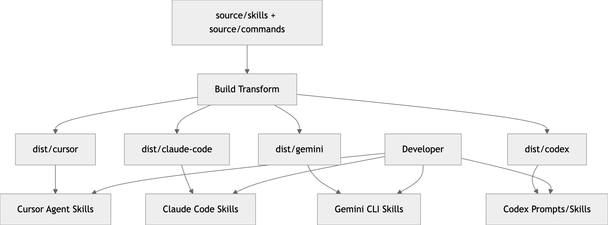 이 구조의 좋은 점은 최저 공통 분모에 맞추지 않는다는 데 있습니다. 개발 가이드는 Cursor가 frontmatter나 argument 지원이 약한 반면, Claude Code·Gemini·Codex는 더 풍부한 메타데이터를 지원한다고 설명합니다. 그래서 원본은 풍부하게 유지하고, 각 플랫폼으로 갈 때 필요한 수준만큼 변환합니다. (GitHub)