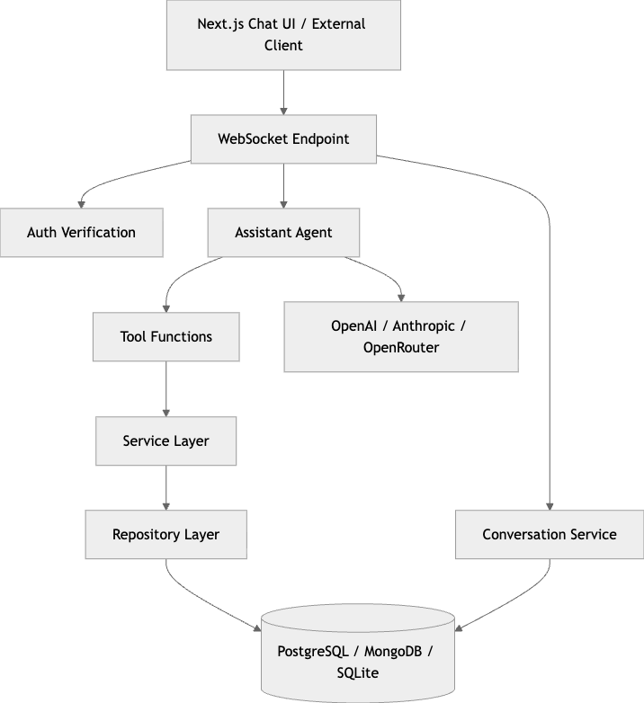 이 저장소의 가장 좋은 부분 중 하나는 아키텍처 문서가 꽤 정직하다는 점입니다. 백엔드는 API Layer → Service Layer → Repository Layer → Database의 전형적인 레이어드 아키텍처를 따르고, 라우트는 얇게 유지하고 비즈니스 로직은 서비스로 위임하며, 리포지토리는 데이터 접근을 담당하도록 구분합니다. (GitHub)