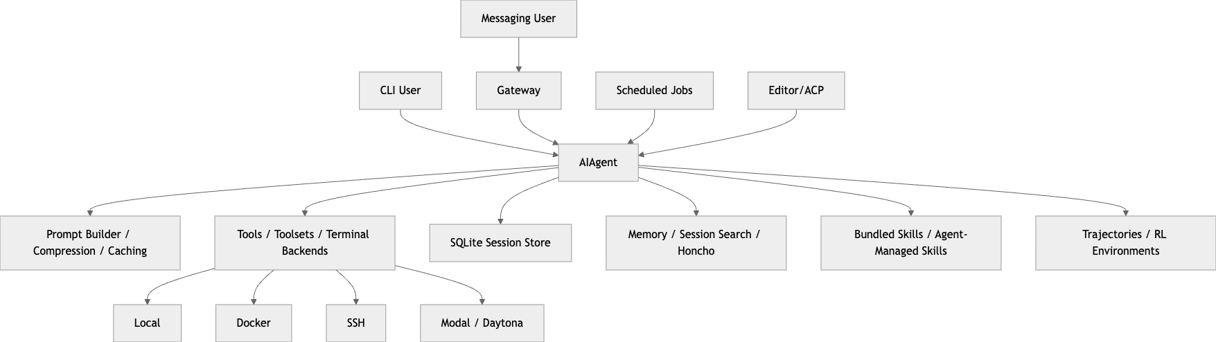 실제로는 스킬을 축적하고, 세션을 검색하고, 여러 플랫폼에서 같은 에이전트로 동작하며, 장기 자동화와 연구용 데이터 생성까지 감안한 운영형 에이전트 시스템에 가깝다. (GitHub)