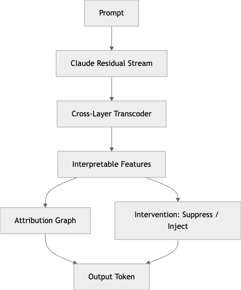 핵심은 “Claude가 왜 그런 답을 했는지, 내부 계산 그래프를 부분적으로라도 추적할 수 있게 됐다”는 데 있습니다. Anthropic은 이를 위해 뉴런 단위 대신 더 해석 가능한 feature를 사용했고, 이 feature들이 입력에서 출력까지 어떻게 연결되는지 attribution graph로 시각화했습니다. 또한 특정 feature를 억제하거나 주입해서 출력이 실제로 바뀌는지 확인하는 개입 실험까지 수행했습니다. 즉, 단순한 상관관계 관찰이 아니라, 어느 정도의 인과적 검증까지 시도한 것입니다. (Transformer Circuits)