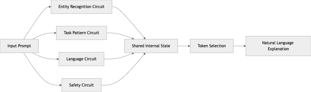 LLM의 출력은 하나의 단일 알고리즘이 아니라, 여러 병렬 회로의 경쟁과 협력의 결과라는 것입니다.