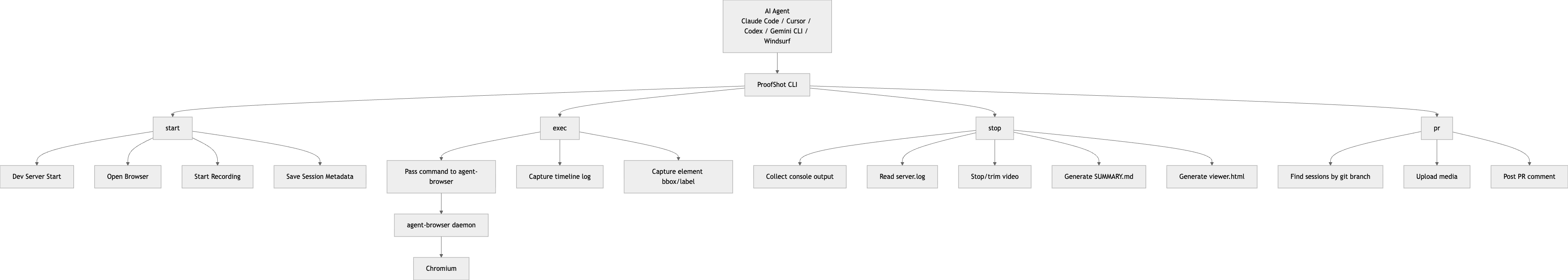 ProofShot의 가장 중요한 결정은 브라우저 자동화 엔진으로 agent-browser를 선택한 것이다. 아키텍처 문서에 따르면, ProofShot은 브라우저 자체를 구현하지 않고 agent-browser CLI를 감싸는 얇은 오케스트레이션 레이어다. 그래서 Claude Code든 Cursor든 Codex든, “셸 명령을 실행할 수 있느냐”만 충족하면 같은 방식으로 붙일 수 있다. (GitHub)
