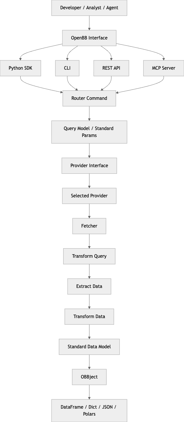 OpenBB의 응답은 OBBject라는 표준 객체로 감싸진다. 이 객체는 results, provider, warnings, extra 같은 메타데이터를 포함하고, to_dataframe(), to_dict(), to_numpy(), to_polars() 같은 변환 메서드를 제공한다. 단순히 JSON을 리턴하는 수준에서 끝나지 않고, 분석 파이프라인으로 바로 넘기기 좋은 형태를 기본 제공하는 셈이다. (OpenBB 문서)