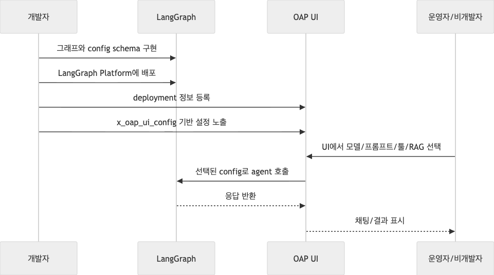 백엔드 그래프 스키마가 곧 어드민 UI 계약서가 된다는 겁니다. OAP는 이 계약을 읽어 UI를 만들고, 사용자는 웹에서 조정하고, 실행은 여전히 LangGraph가 담당합니다. (GitHub)