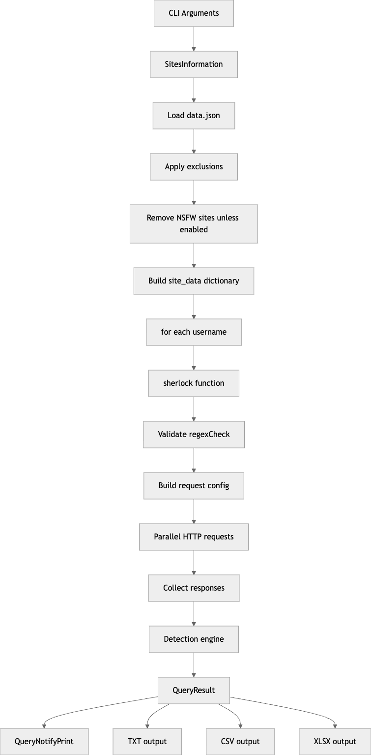 즉, Sherlock의 본질은 “스크립트”보다 username existence resolution engine에 더 가깝다. (sherlockproject.xyz)