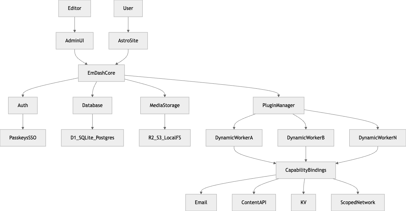 EmDash의 핵심은 “CMS 코어, 콘텐츠 저장, 렌더링, 확장 코드”를 서로 다른 책임으로 분리한 데 있습니다.