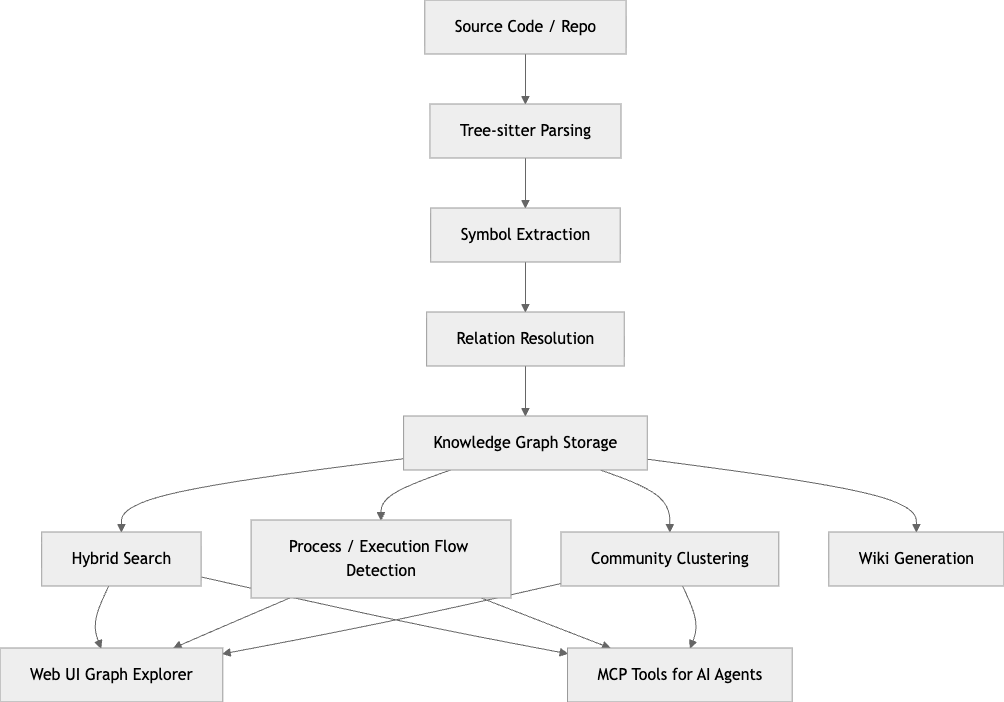 문서와 README를 종합하면 인덱싱 파이프라인은 대략 다음 순서로 이해할 수 있습니다. 먼저 파일/폴더 구조를 수집하고, Tree-sitter로 함수·클래스·메서드·인터페이스를 추출합니다. 다음으로 import, 함수 호출, 상속, self/this 리시버 타입을 해석합니다. 그 위에 기능 단위 클러스터링과 엔트리 포인트 기반 실행 흐름 탐지를 얹습니다. 최종 결과는 그래프 DB에 저장되고, 검색·시각화·MCP 도구가 이를 재사용합니다. (GitHub)