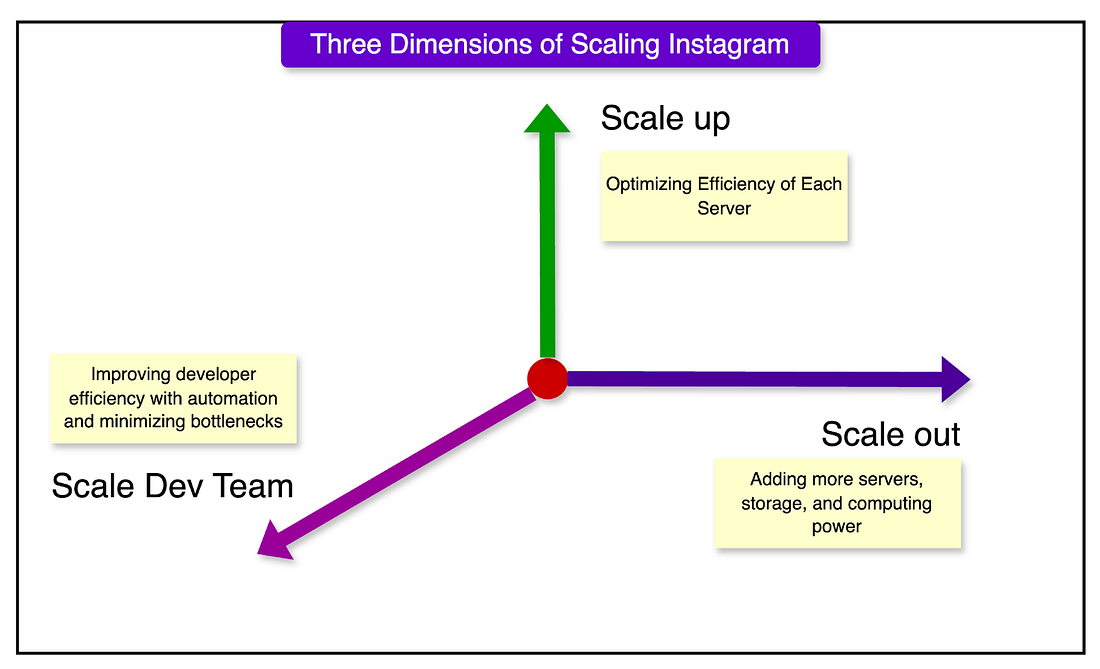 확장은 단순히 하드웨어를 추가하는 것이 아닙니다. 리소스를 최적화하고 엔지니어링 팀이 효율적으로 운영할 수 있도록 하는 것도 포함됩니다. Instagram은 세 가지 핵심 차원에서 확장성에 접근했습니다.