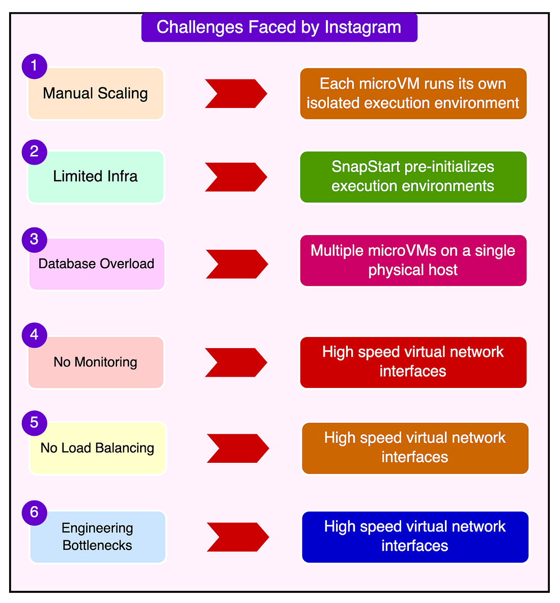 - 자동화된 모니터링 부족: Instagram에는 소규모 엔지니어링 팀이 있었기 때문에 서버 성능 모니터링은 수동으로 이루어졌으며, 종종 시스템 장애를 피하기 위해 지속적인 주의가 필요했습니다. 엔지니어는 기본 대시보드와 알림을 사용하여 문제를 감지했지만 성능 문제에 자동으로 대응할 실시간 시스템은 없었습니다.