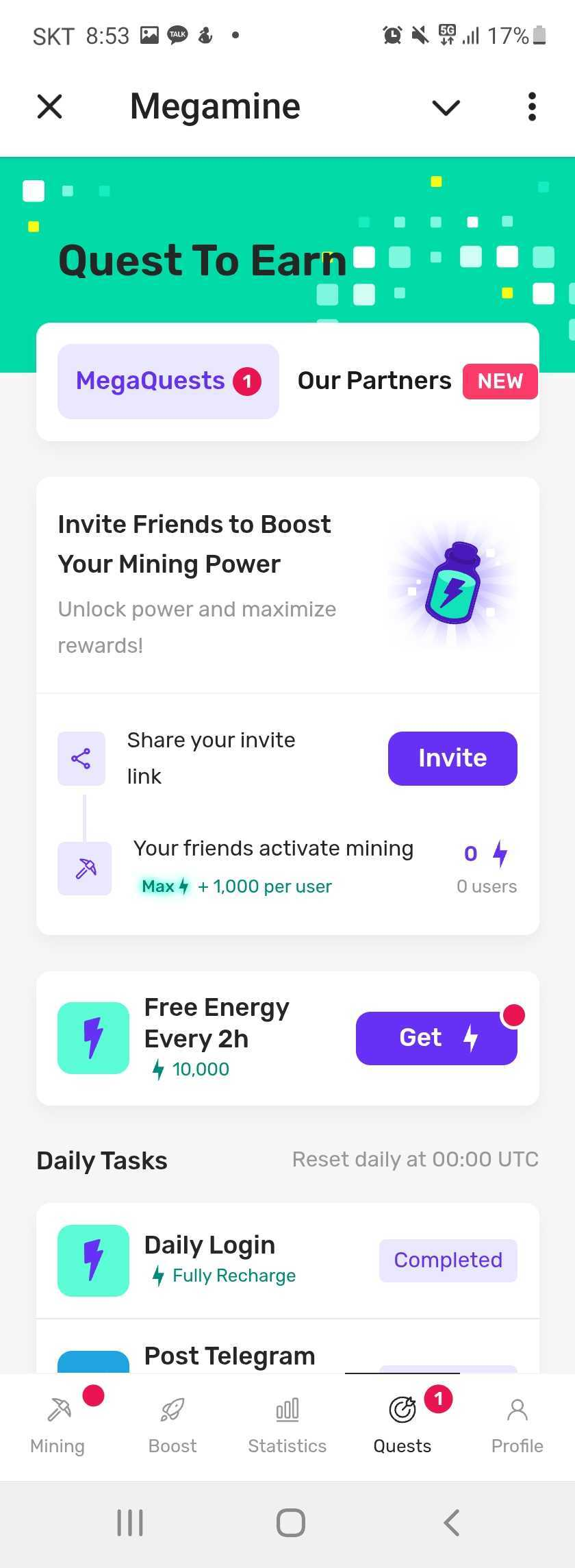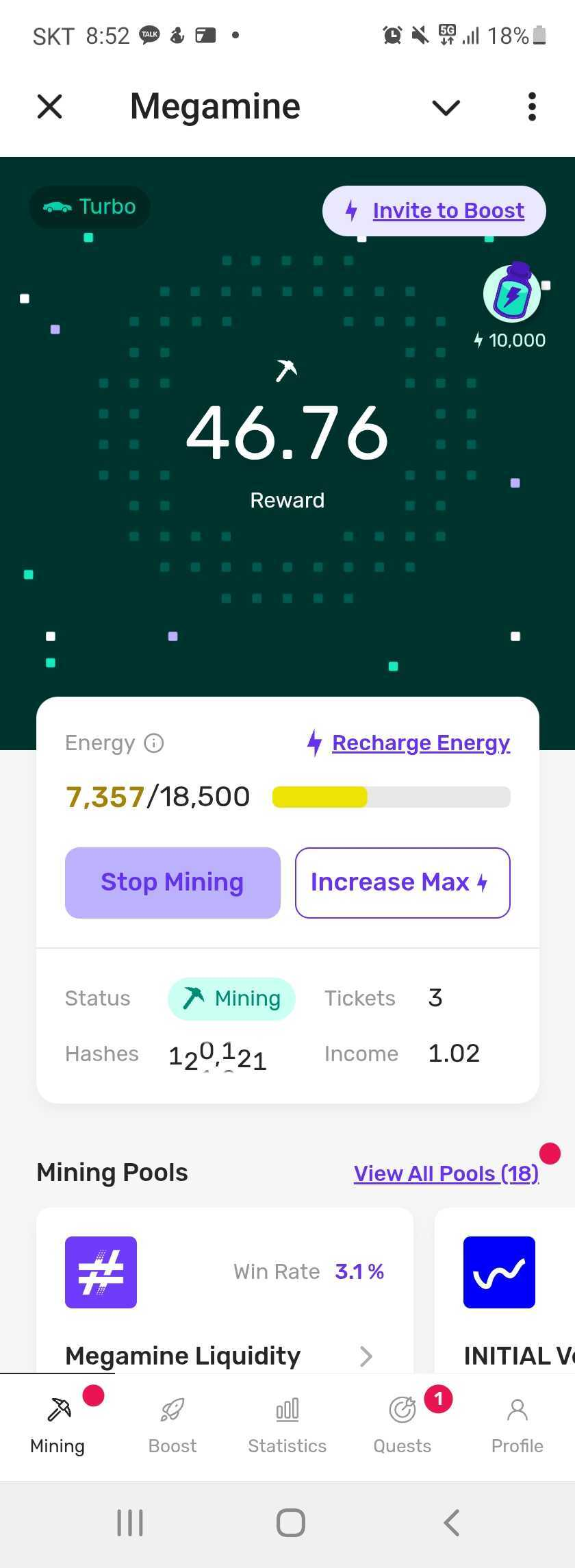 하지만 MegaMine 터보는 최소 10,000 맥시멈 에너지가 있어야 해서 유료결제 최소 10,000원 이상 결제가 되셔야 될 수도 있습니다.