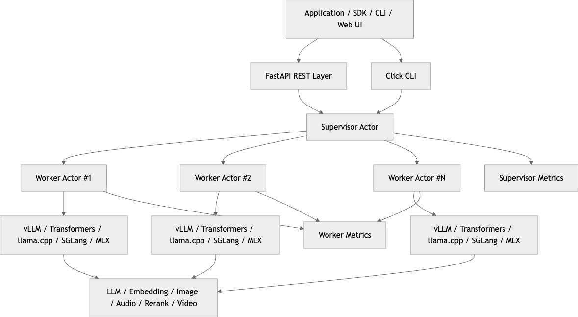클라이언트는 REST나 CLI로 요청하지만, 실제 실행은 supervisor가 worker에게 할당하고, worker가 해당 엔진을 통해 모델을 로드·실행합니다. 그래서 로컬 단일 서버와 멀티노드 클러스터가 같은 운영 모델을 공유할 수 있습니다. (inference.readthedocs.io)